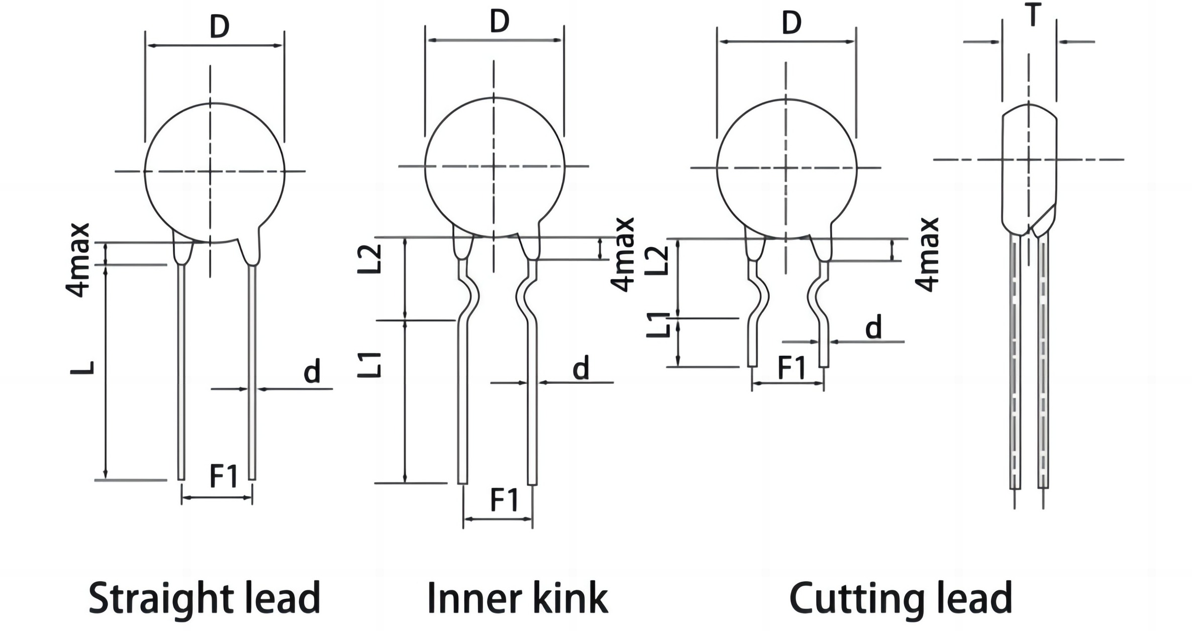 | 寸法(mm) | Dマックス | Tマックス | d±0.05 | F1±1 | ストレートリード | 曲がったリード | |